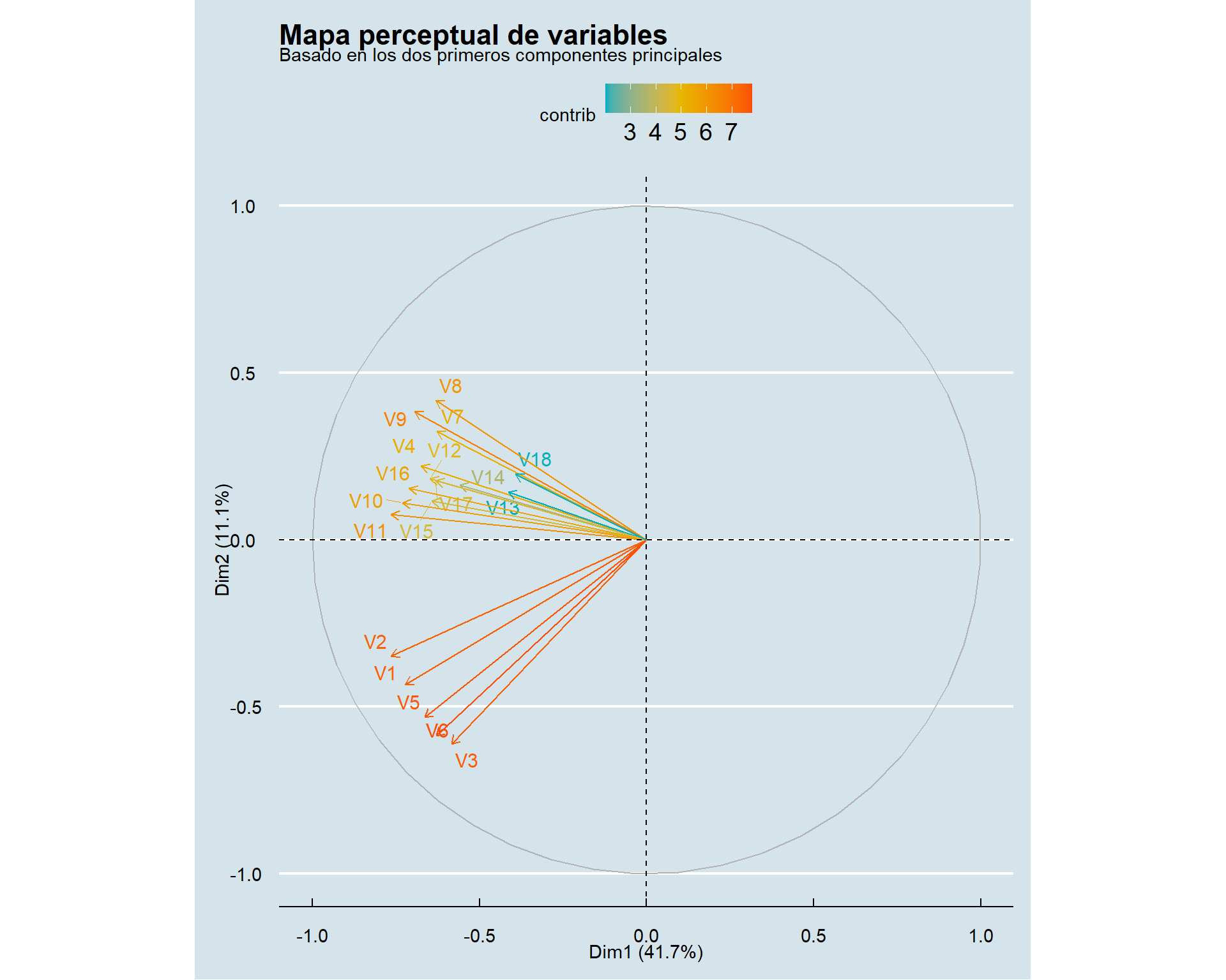 Finalmente, podemos visualizar qué variables contribuyen más a la creación de cada una de las dimensiones. Esto nos ayuda a confirmar el nombre que le dimos a cada componente.