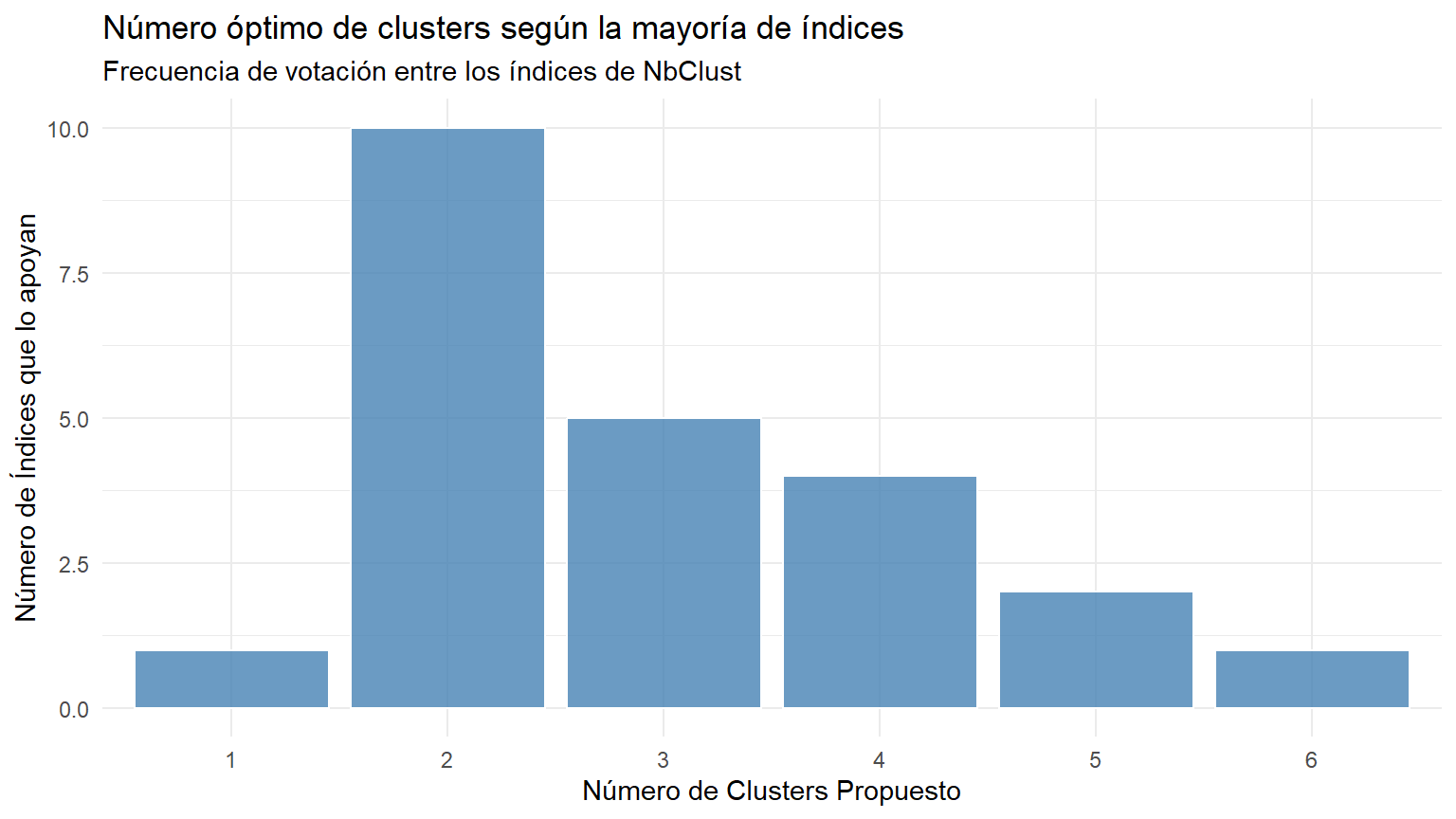 labs(title = "Número óptimo de clusters según la mayoría de índices",